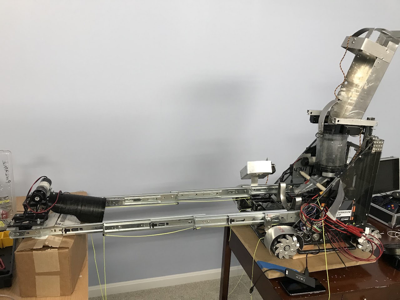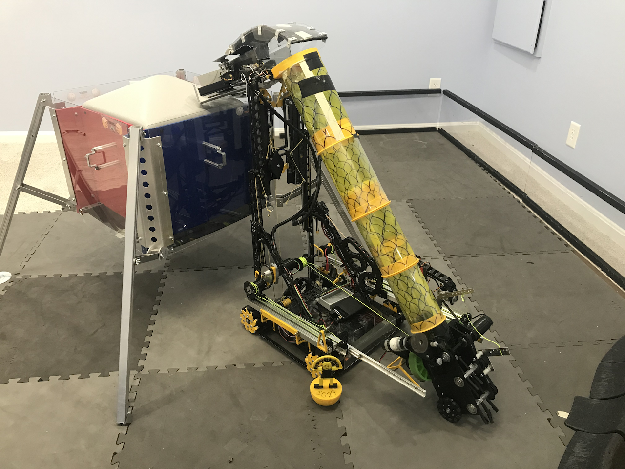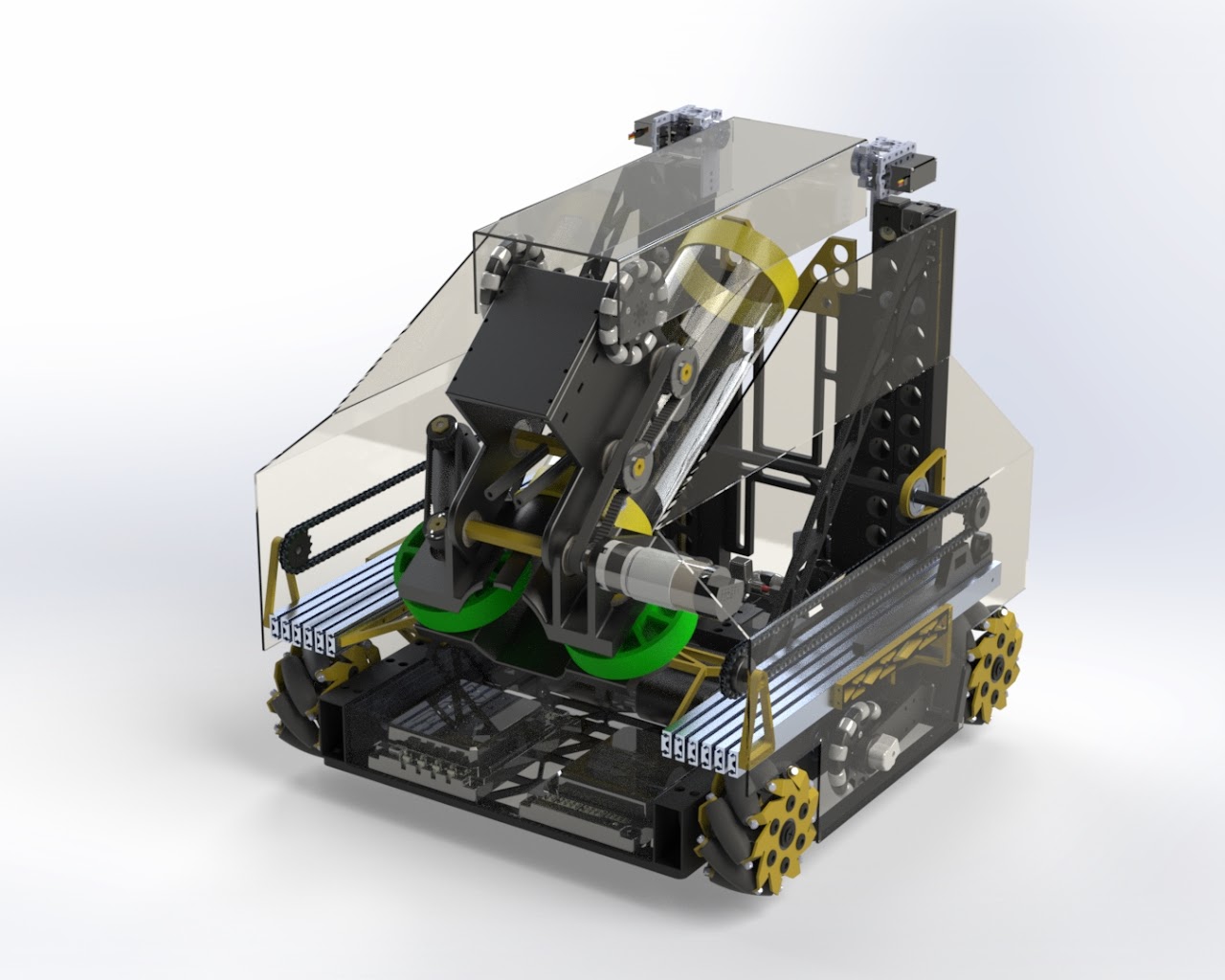 FIRST Tech Challenge Rover Ruckus season (2018-2019) as Captain of a 14-member team. Engineered a robot to pick, sort, and score minerals (balls and blocks) into the cargo hold 2 at a time, featuring a double flywheel launching mechanism with fully custom machined components. Built with Java, OpenCV, TensorFlow, odometry/localization, SolidWorks, 3D printing, mill, lathe, and water jet.